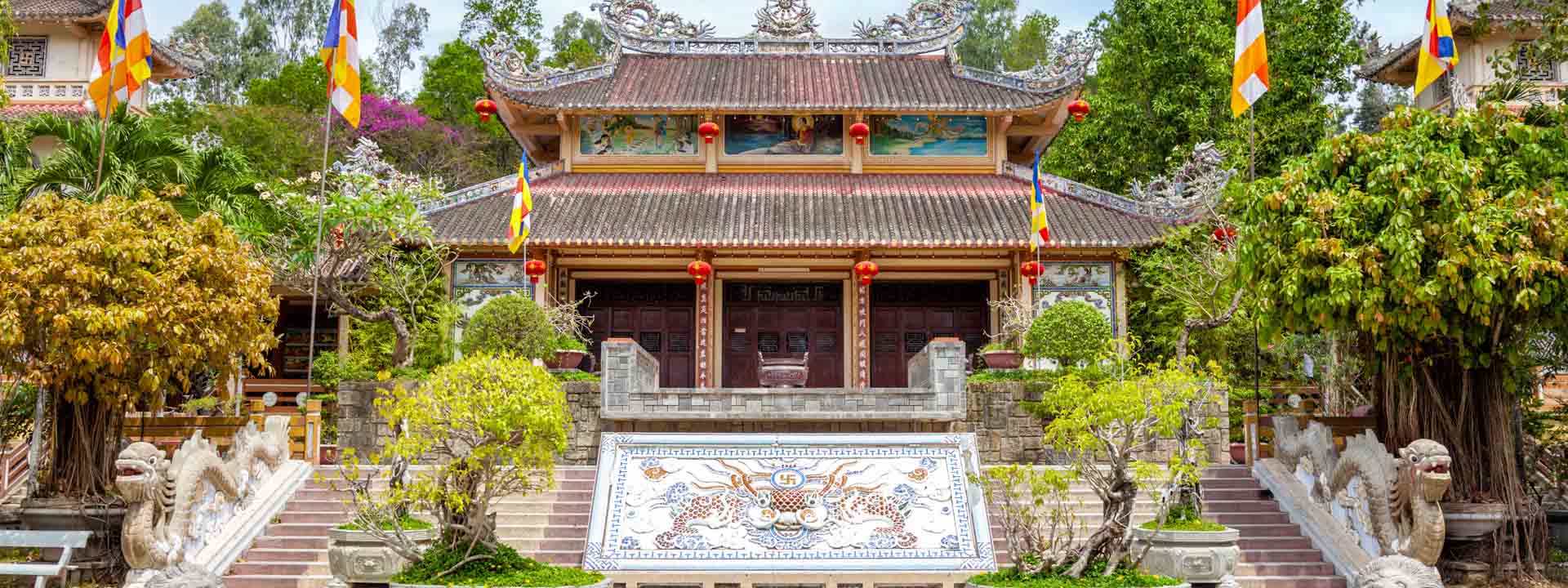 Travel across the countryside by car, viewing the rice paddies, orchards and cattle or buffaloes at work. You will meet rural people and find out how they earn a living and see highlights and places such as: charcoal stove (pottery) making house, a sedge mat weaving village (you can try weaving), fish cake frying house, bakery, rice paper steaming village, conical hat making village, soya milk making house, ancient house with bonsai garden (180 years, enjoy fruits and green tea). Visit Long Son Pagoda (the biggest one in Nha Trang with a white giant Buddhist statue on the hill top) Lunch in a restaurant on the riverside.